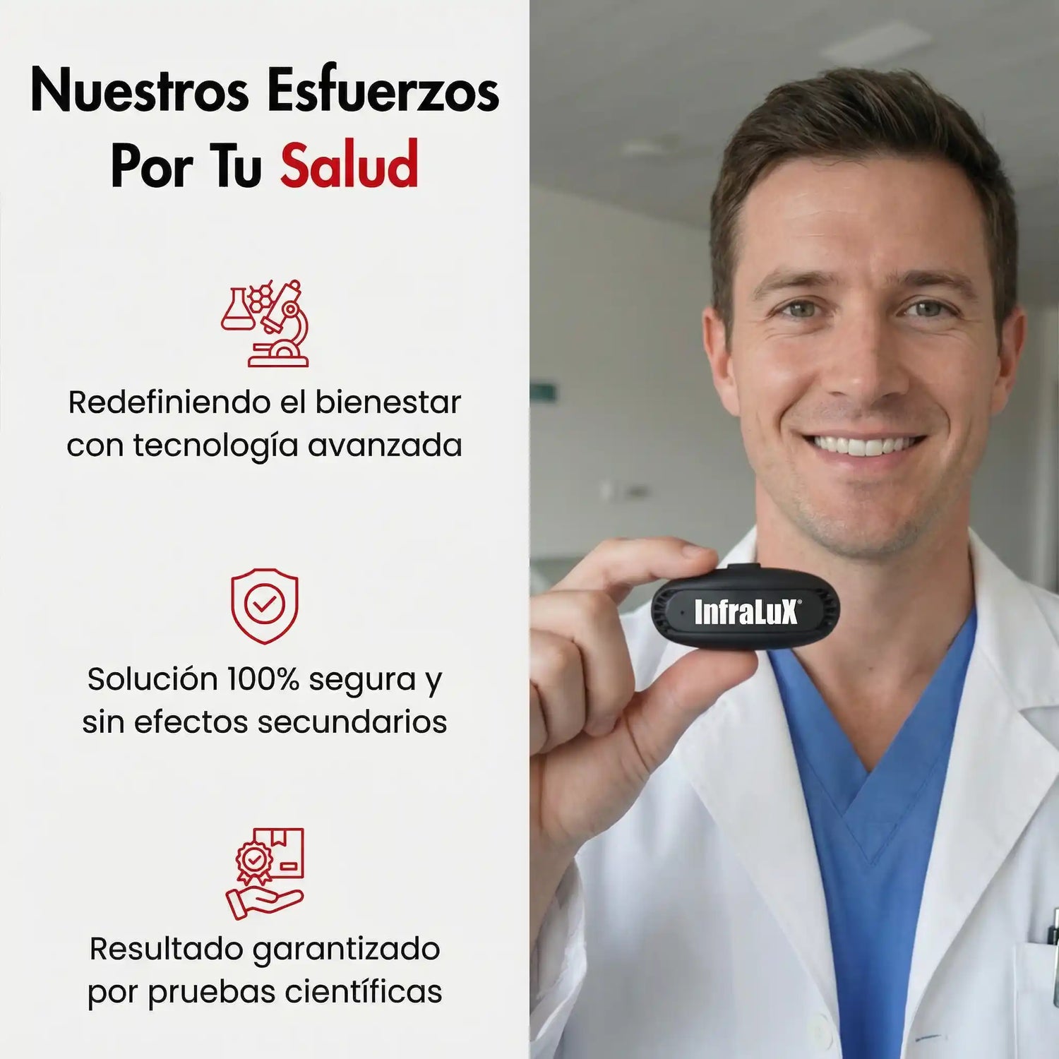 Entendemos la importancia de su salud, y por eso InfraLux® AIR se elabora con precisión y cuenta con la aprobación de investigaciones científicas. Nuestro objetivo es ofrecerle una solución natural, eficaz y fácil de usar que se integre a la perfección en su rutina diaria.